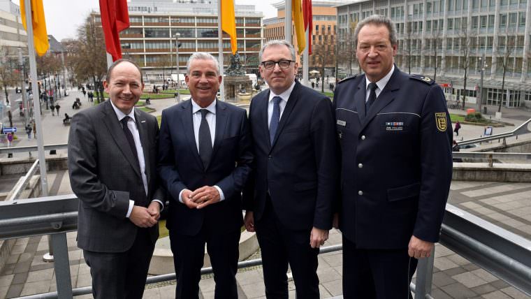 v.l.n.r.: Erster Bürgermeister und Sicherheitsdezernent Christian Specht, Innenminister des Landes Baden-Württemberg Thomas Strobl, Oberbürgermeister Dr. Peter Kurz, Polizeipräsident Thomas Köber | Foto: Stadt Mannheim / Thomas Tröster